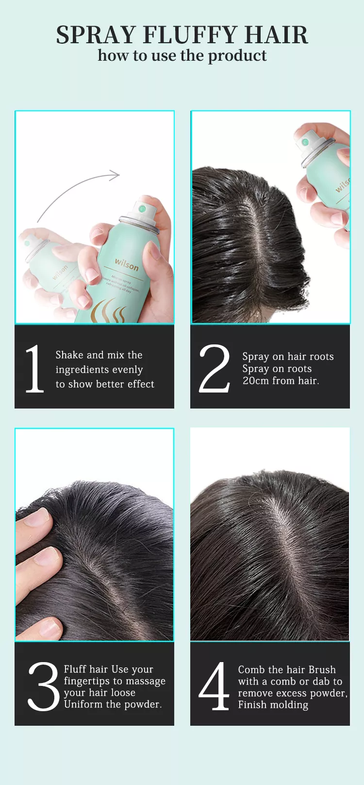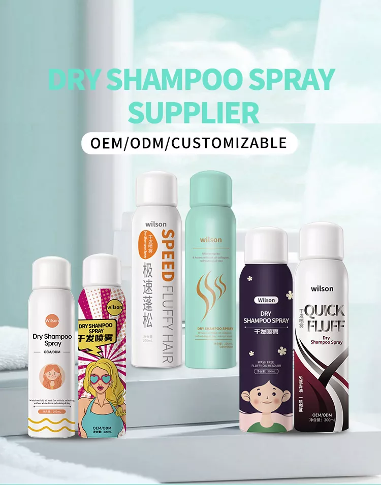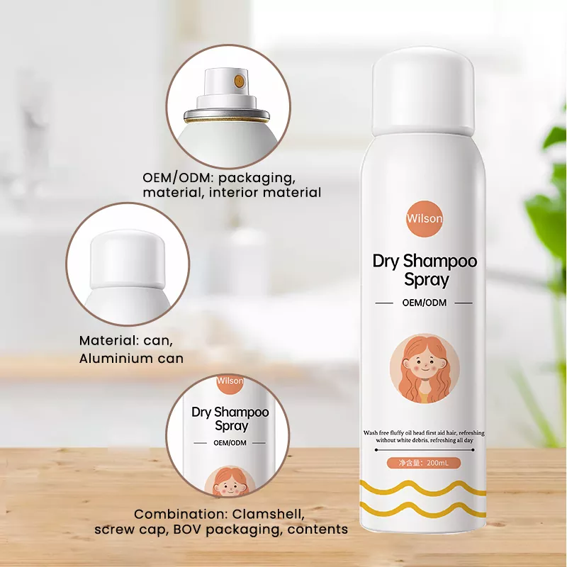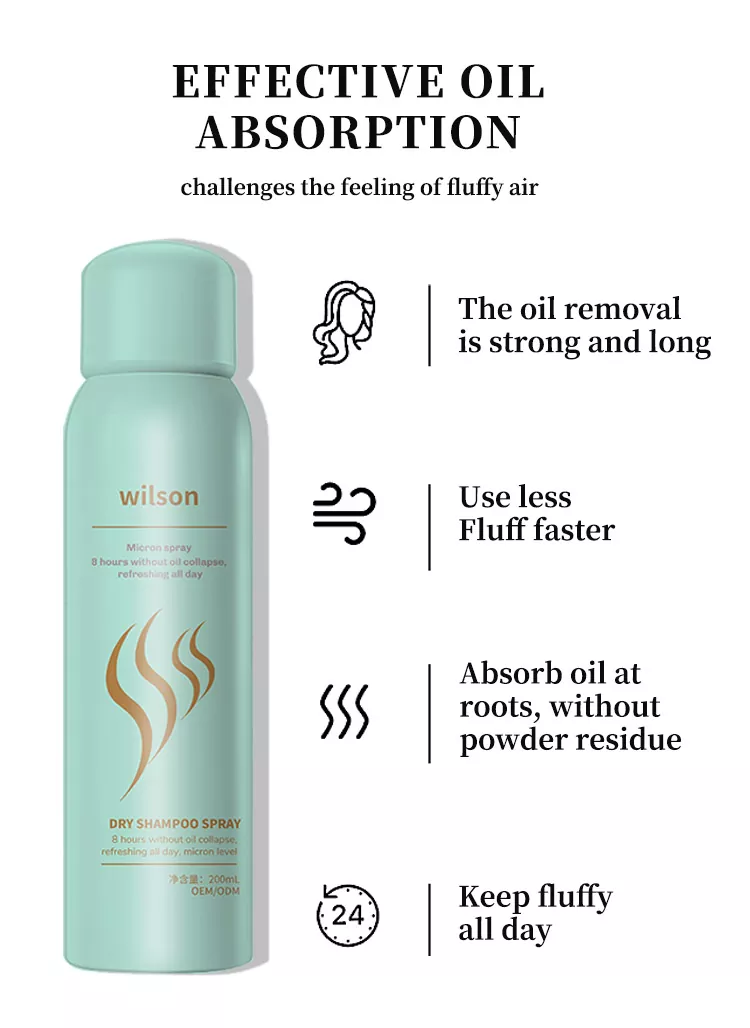 Wilson Instant bez mytí chladivý suchý šampon ve spreji s přidáním glycerinu, triglyceridu, vitaminu E, vitaminu B5 a dalších složek vlasové péče, aby vlasy vyživily a zvlhčily, doplnily lupy a samotné vlasy o nedostatek přísad, a zároveň doplnily vlasovou olejovou vrstvu, opravily poškozené vlasy, chránily hlavu před vnějším prostředím a nakonec dosáhly účelu obnovy zdravých vlasů.