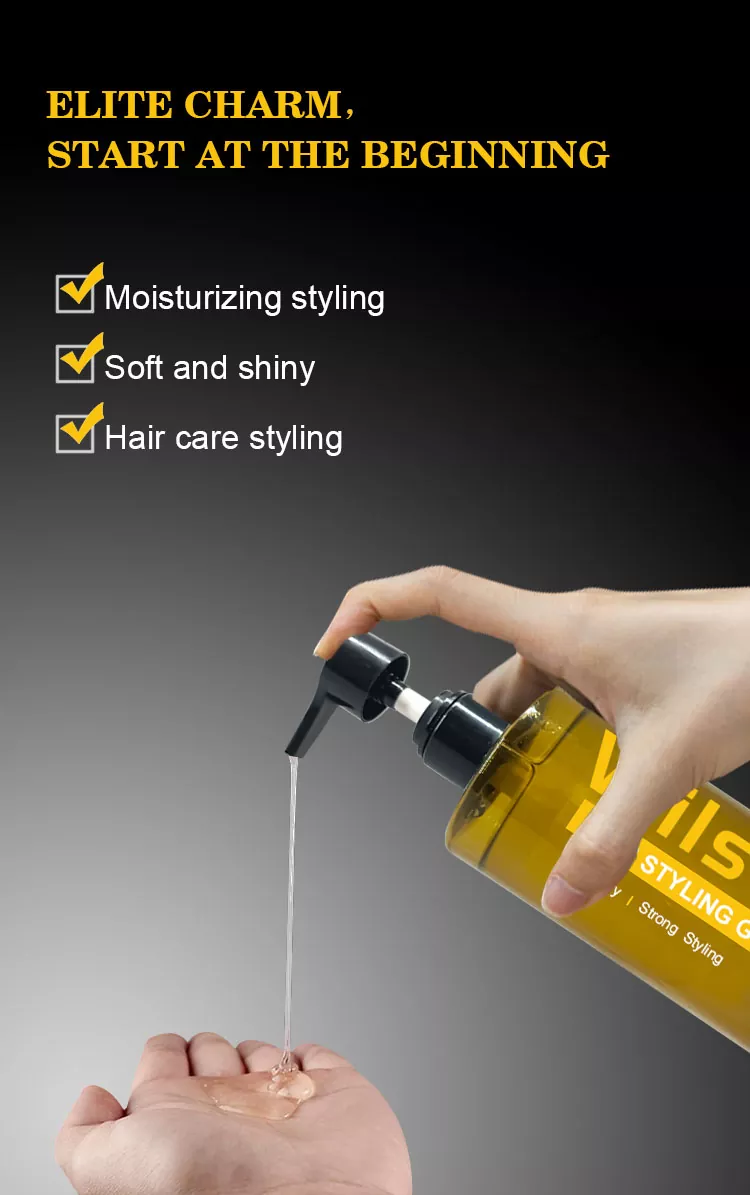 Pánská kosmetika Wilson Ultra Smooth Seamless Hair Styling Gel označuje vlasový styling a upravující účinek kosmetiky, nastříkané nebo nanesené na vlasy, odpařování rozpouštědla a sušení na vlasech za vzniku průhledného filmu, takže vlasové vlákno ztuhne a udrží tvar účelu, aby vyhovoval potřebám různých účesů.